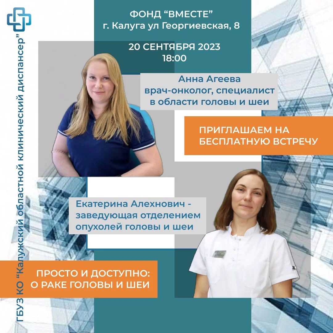 В неформальной обстановке заведующая отделением опухолей головы и шеи Калужского онкодиспансера Екатерина Алехнович и врач-онколог, специалист в области головы шеи и кожи Анна Агеева проведут открытую встречу для всех желающих и ответят на вопросы.