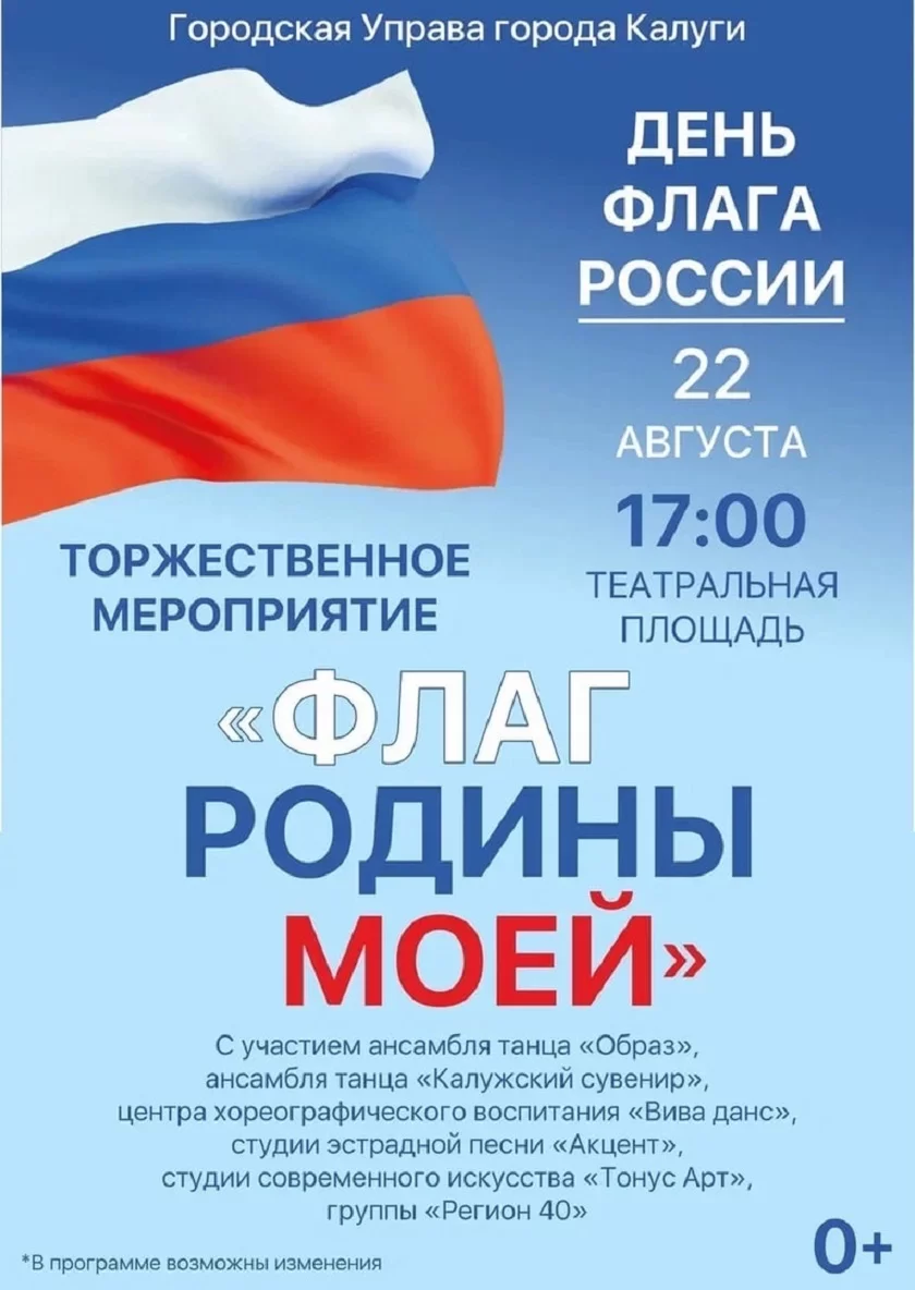 Мероприятие «Флаг Родины моей» начнётся в 17:00. Вход свободный. Творческие выступления для гостей и калужан покажут танцевальные ансамбли «Образ» и «Калужский сувенир», центр хореографического воспитания «Вива данс», студия эстрадной песни «Акцент», студия современного искусства «Тонус Арт» и группа «Регион 40».
