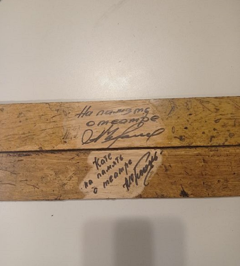 Паркет остался после масштабного ремонта театра. Паркетины сняты с зеркального фойе и на каждой стоит автограф работников театра.