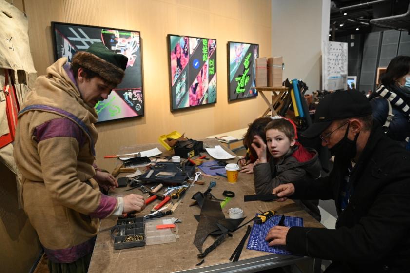 А клуб реконструкторов "Булат" из Наро-Фоминского района Московской области предложил посетителям сделать на память кожаные украшения в стилистике Древней Руси.