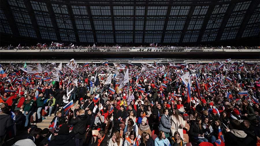 На этом митинге предполагается участие Президента России Владимира Путина. По информации депутата Законодательного Собрания Надежды Ефремовой, которая приехала в Лужники в качестве зрителя, народ здесь начал собираться за несколько часов до начала торжеств. Всем зрителям организаторы предлагали бесплатный горячий чай с булочкой, а на местах каждого ожидал небольшой флаг России.