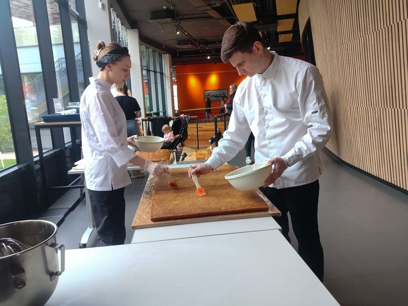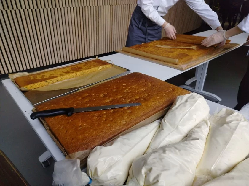 «» «Торт мы собираем из испечённых заранее коржей, здесь мы их соединяем между собой. В этом году будет новое уникальное украшение торта. Он будет очень большой и вкусный», - рассказала кондитер Ирина.