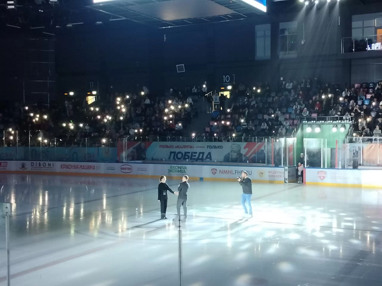 Перед началом игры традиционно проходит предматчивое шоу. Сегодня финальной точкой программы стало предложение руки и сердца. Прямо с центра ледовой арены молодой человек признался в любви своей девушке, с которой он познакомился на хоккее. Калужанка сказала «Да».