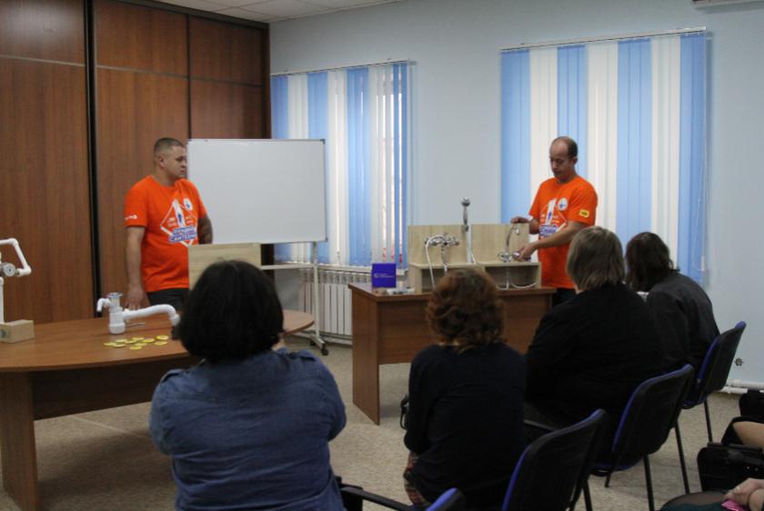 Максим Купрюхин и Вячеслав Арцышевский показали возможные поломки в смесителях, рассказали о необходимых инструментах и расходных материалах, подробно объяснили процесс разборки оборудования, замены деталей и сборки. Желающие могли попробовать самим разобрать и собрать краны.