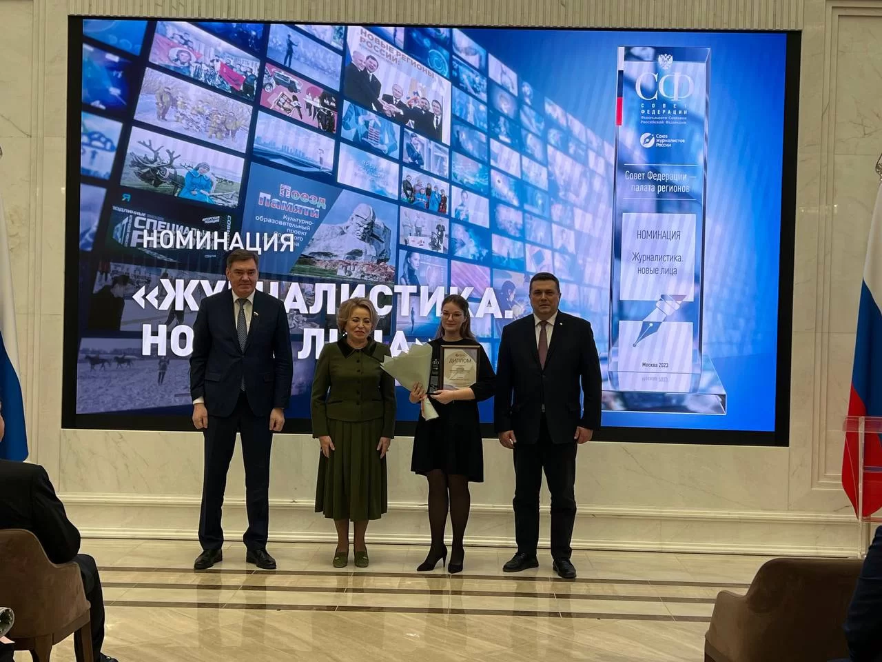 Накануне Дня российской печати в Совете Федерации наградили победителей конкурса СМИ «Совет Федерации – палата регионов». В номинации «Журналистика. Новые лица» второе место заняла студентка КГУ им. Циолковского Екатерина Семенова. Она взяла интервью у священника, вернувшегося из зоны СВО. В награждении приняли участие Председатель Совфеда Валентина Матвиенко, Председатель Союза журналистов России Владимир Соловьев и сенатор Александр Савин.