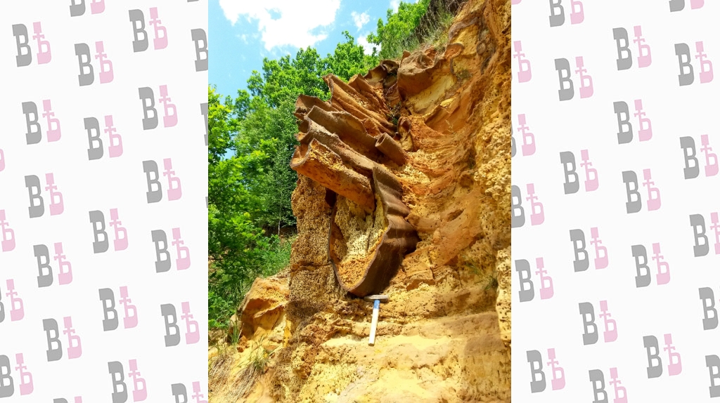 На окраине села Корекозево Перемышльского района есть старый, уже несколько лет не разрабатываемый карьер. Он «двухэтажный»: сверху - отложения, оставленные тающим ледником сравнительно недавно (порядка 12 тысяч лет назад), в них, кстати, можно найти принесенные со Скандинавии минералы, даже самоцветы вроде граната и аметиста), а вот на дне - пляж моря каменноугольного периода. Среди железистых конкреций в песке попадаются ровные «палочки» с параллельными бороздками, иногда с поперечными узлами-перетяжками(фото 4) - это кусочки стеблей, росших здесь в раннем каменноугольном периоде (Визейский ярус, как говорят палеонтологи) древовидных хвощей - каламитов.