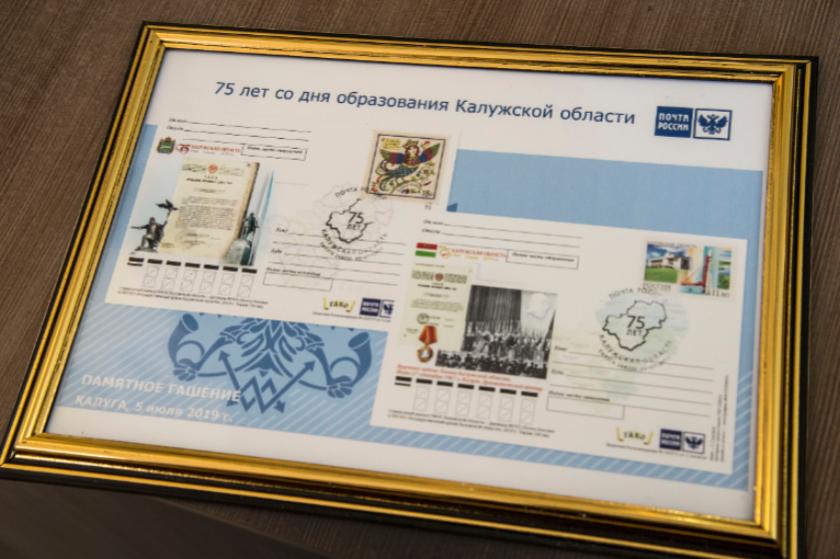 Калужский филиал Почты России выпустил к этому событию два вида немаркированных открыток и уникальный художественный штемпель специального гашения, который будет действовать только один день, 5 июля. На открытках изображены монументальные памятники Калуги, страницы официальных документов – Указов Президиума Верховного Совета СССР от 1944 года «Об образовании Калужской области в составе РСФСР» и от 1967 года – «О награждении Калужской области орденом Ленина»