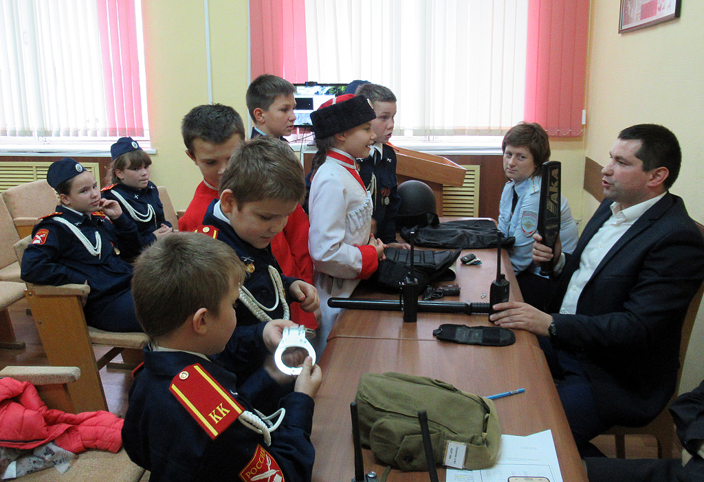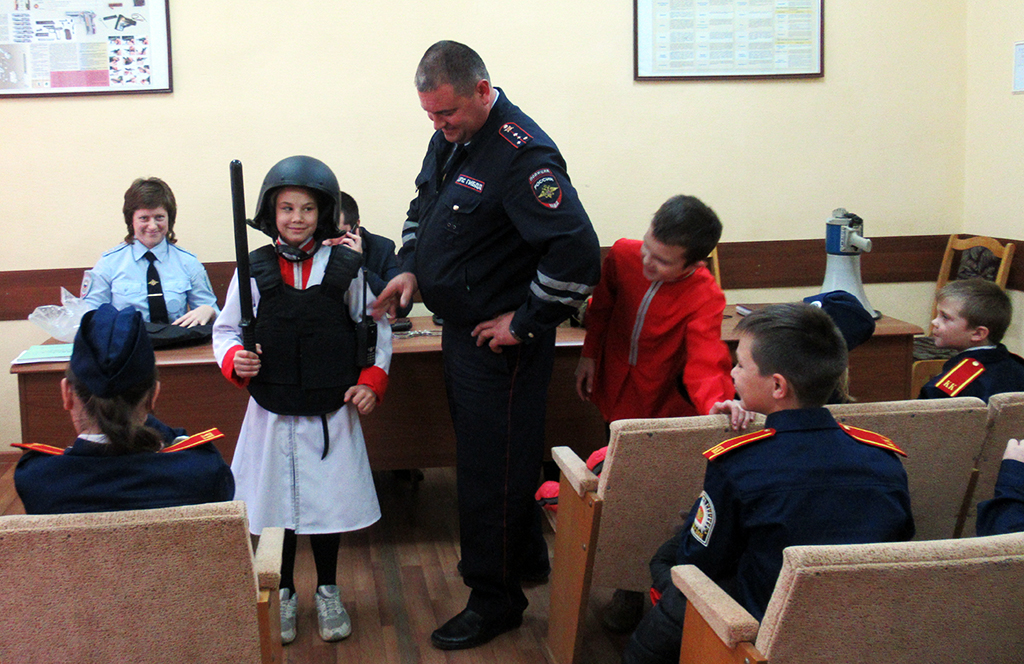 В кабинете, где проводятся учебные занятия и совещания, ребят уже ждали представители ведомства. На столе лежали «рабочие инструменты» полицейских– учебный пистолет, бронежилет, каска, дубинка, противогаз, рация, громкоговоритель, сканер для обнаружения металлических предметов.