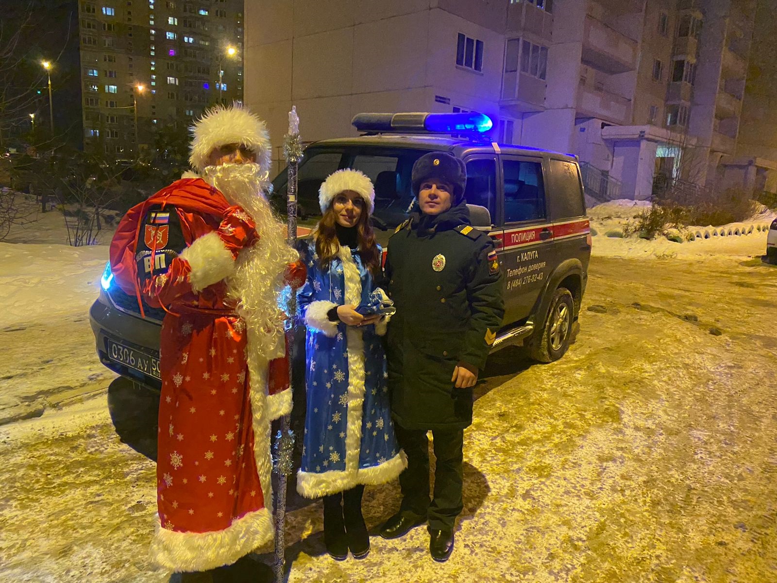 В предпраздничные дни командование военной комендатуры города Калуги поздравило личный состав и членов их семей. Для поздравления были привлечены настоящие "военно-полицейские" Дед Мороз и снегурочка, которые передали подарки и сладкие угощения детям и их родителям. Передвигались сказочные герои на специальных санях, которые могли увидеть жители Правого берега.