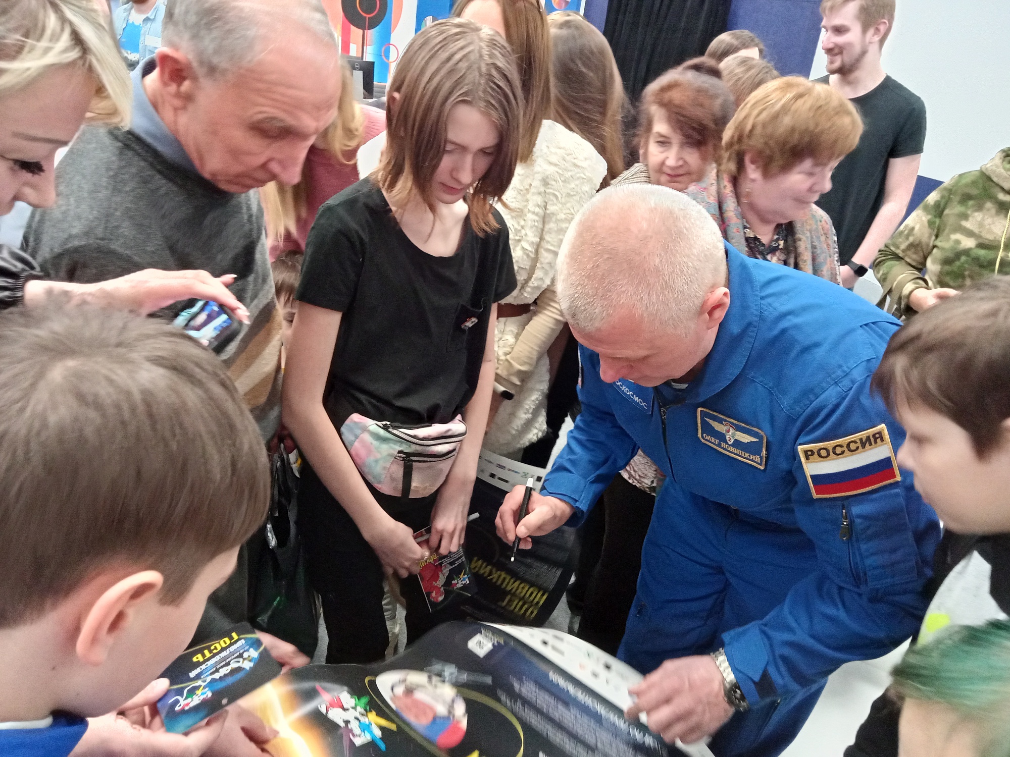 В Музее истории космонавтики в рамках космического кинофестиваля 14 апреля состоялась встреча Олега Новицкого с жителями областного центра, многие из которых пришли с детьми.