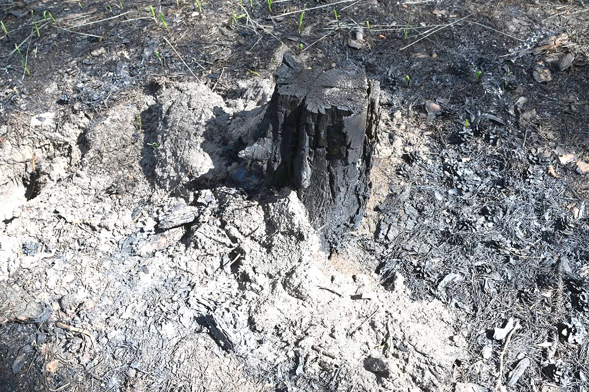 Солнце жарит не по-майски. Под ногами рассыпается в труху лесная подстилка. Мы идем по черному пятну в сосняке прямо у села Корекозево, что в Перемышльском районе. Горело здесь на прошлой неделе. В будний день, сразу после майских праздников, когда народ уже закончил с шашлыками-пикниками и отправился на работу, такого никто не ожидал.