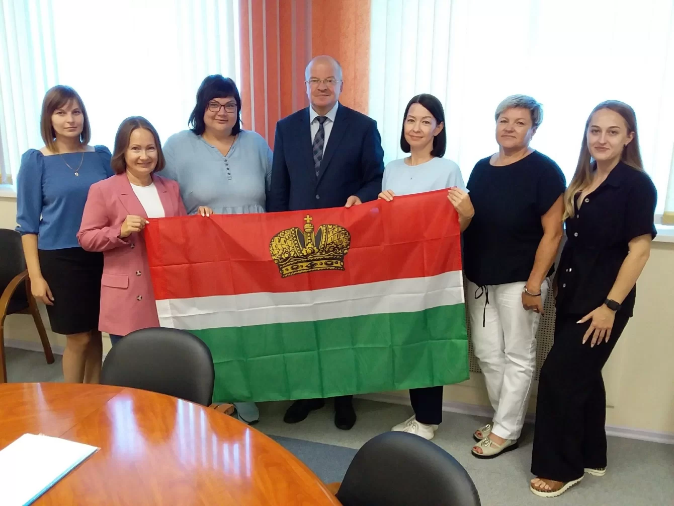 В конце встречи Александр Аникеев вручил учителям флаг нашего региона как объединяющий символ педагогической команды, которая поедет на Всероссийский форум классных руководителей.