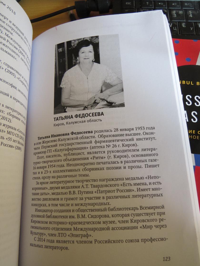 Еще один сборник, где представили своё творчество руководители наших литературных объединений, называется «Энциклопедия. Большая литературная карта России 2018 года». В нём опубликованы стихи и проза 35 авторов из разных уголков России на двух языках – русском и английском. Издана она тиражом 3000 экземпляров. В рамках этого культурного проекта по популяризации русского языка авторам подарили авторские экземпляры. Остальная часть тиража предназначена англоязычным читателям разных стран, представляя за рубежом современную русскую литературу.
