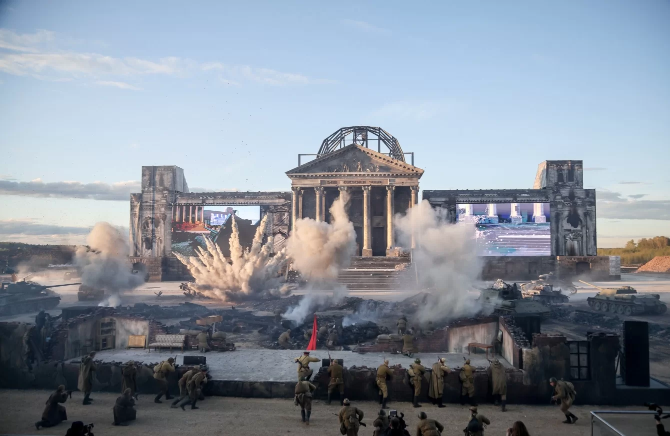 Специально для постановки «Победа! Знамя над Рейхстагом» в кинопарке возвели огромную декорацию полуразрушенного Рейхстага в натуральную величину, что позволило создать атмосферу полного погружения. Перед ней – Королевская площадь, по которой наши войска двигались к главному зданию Берлина. Масштаб битвы помогали почувствовать настоящие танки, пушки и атаки пехоты на натурной площадке «Рубежи обороны». А усиливали его пиротехнические эффекты. На больших экранах демонстрировались кадры кинохроники и специально снятые сюжеты, а перед зрительской трибуной, пробиваясь сквозь оборону немцев, Рейхстаг штурмовали советские бойцы.Режиссер-постановщик и автор стихов Александр Жигалкин отметил, что у создателей представления, актеров и реконструкторов в семьях были погибшие и участники Великой Отечественной войны. Поэтому для каждого причастного постановка имеет очень личное звучание. Главные роли исполнили народный артист РФ Алексей Кравченко, заслуженные артисты РФ Сергей Маховиков, Алексей Шевченков, Виктор Добронравов, Сергей Селин, Александр Андриенко, артисты театра и кино Алексей Колган, Иван Замотаев, Михаил Мамаев, Олег Чернов. Во время реконструкции прозвучали стихи Александра Жигалкина, а также поэма заслуженного деятеля искусств России Влада Маленко «Знамя Победы». Кстати, в апреле на кинофестивале «Циолковский» в Калуге Влад Маленко представил авторский спектакль «Человек для любви».