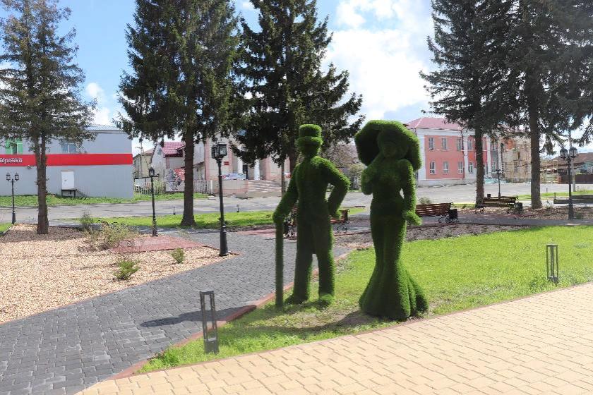 Уже установлены ландшафтные фигуры, топиарии, защитные ограждения тротуаров в виде бетонных полусфер. Как рассказала заместитель главы городской администрации Тамара Бубенцова, предполагается монтаж дополнительных светильников и подсветка прожекторами памятника-макета самолёта Ту-2 «Мещовский колхозник». Дополнительно будут высажены декоративно-лиственные и хвойные растения: туи, можжевельник, ели низкорослые, ивы плакучие, берёзы юнги, барбарисы и другие.