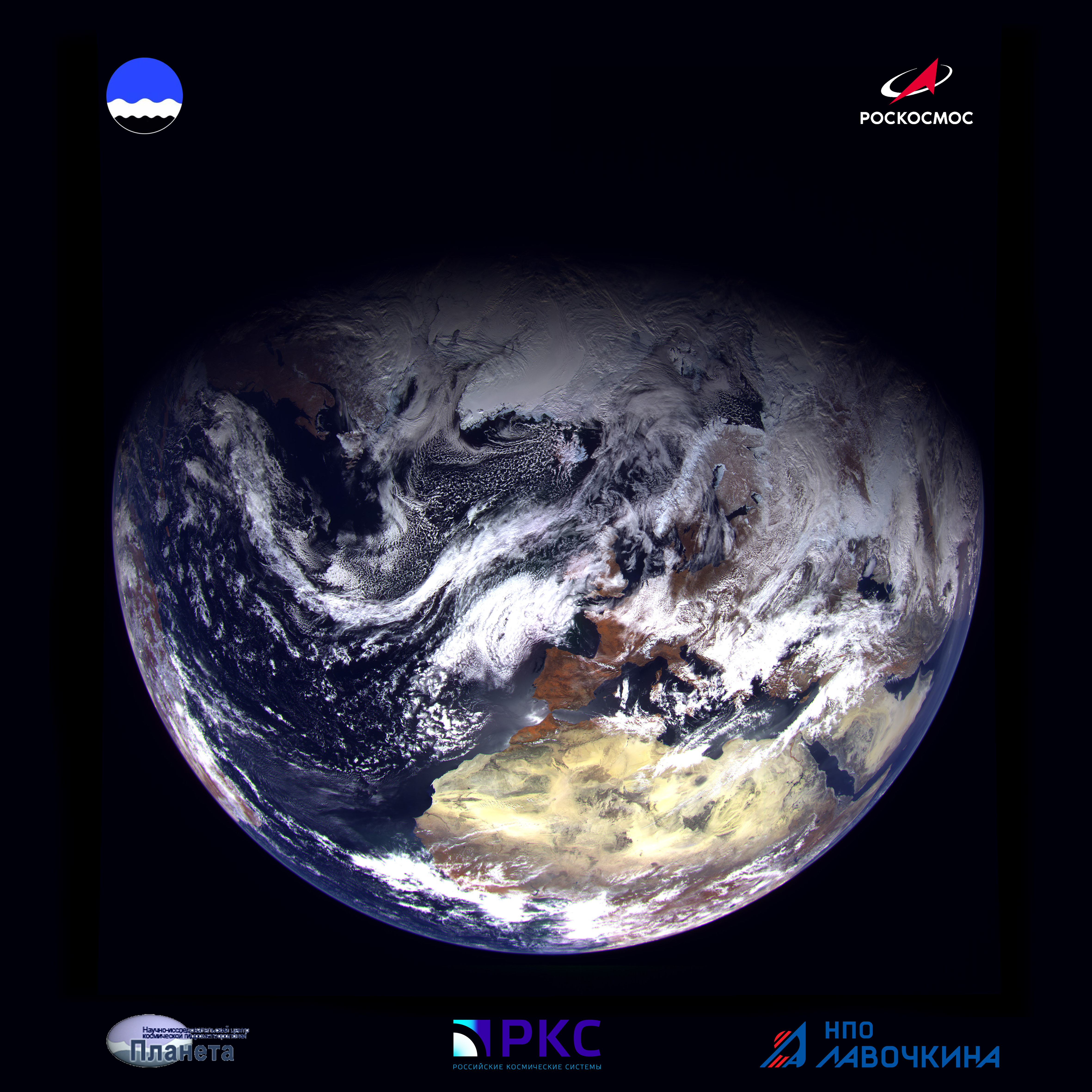 Снимок с высокоэллиптической орбиты, на которой работает спутник, сделан многозональным сканирующим устройством. Два таких сканера будут фиксировать весь доступный для наблюдения с апогейного участка орбиты диск Земли. Они ведут съемку с периодичностью 15-30 минут в видимом и инфракрасном диапазонах.