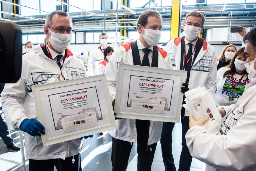 Денис Мантуров положительно оценил высокую социальную ответственность руководства крупнейшего предприятия по производству спортивной одежды, которое оперативно смогло перестроить производство с учётом сложившейся в стране ситуации. По словам руководителя Минпромторга России, в настоящее время маски в стране выпускают несколько десятков тысяч предприятий, в том числе — микропредприятия малого бизнеса. В общем объеме это более 8 миллионов масок в сутки. Помимо этого порядка 4,5 миллионов масок закупается в Китае.