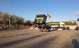 Еще один дерзкий проект краснодарцев – МАЗ, который умеет делать «свечу» и ездить на двух колесах! За нижнюю балку под ним держится человек и постепенно поднимается на капот этой махины. Этот трюк выполнял Александр Мылов.