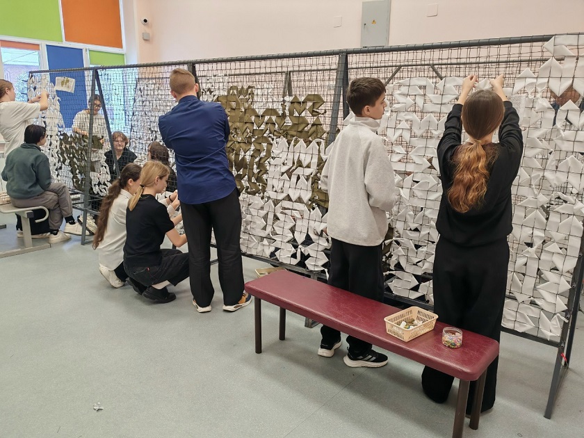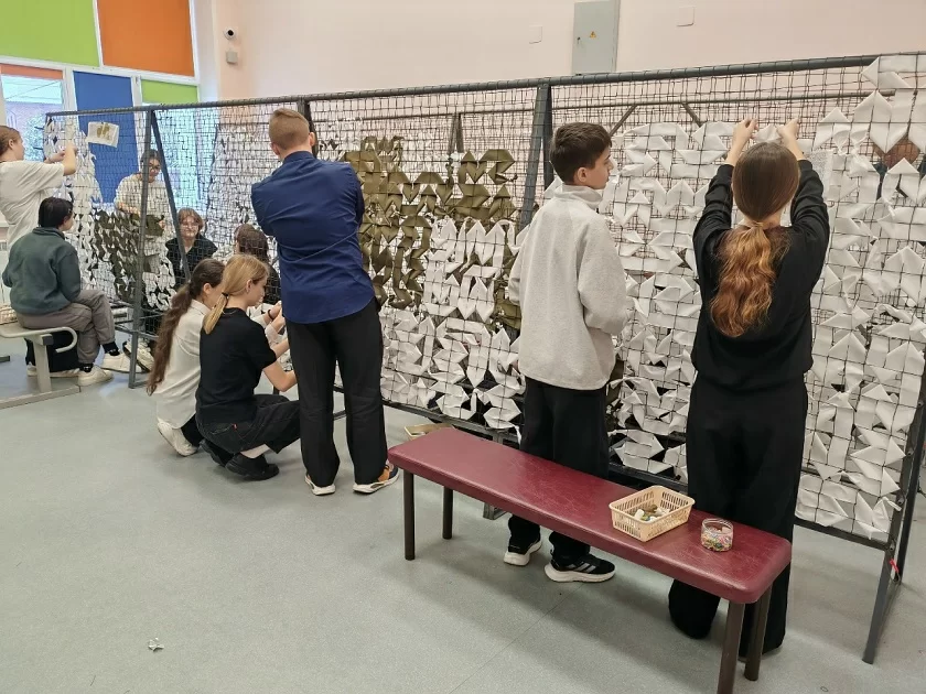 Изготовив масксети для защиты субмарин, волонтеры приступили к исполнению следующего заказа. Сейчас школьники плетут сети для воинов, защищающих Донецкую Народную Республику.