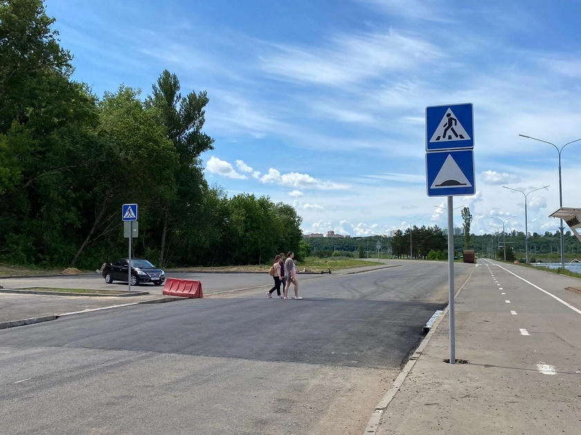 Пешеходный переход на набережной Яченского водохранилища выполнен из асфальтобетонной смеси. Около него стоят дорожные знаки «Искусственная неровность» и «Пешеходный переход», предупреждающие автомобилистов о необходимости снизить скорость.Она не должна превышать 40 км/ч. Об этом водителей также предупреждают знаки.