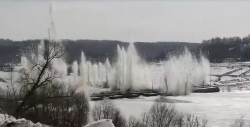Для подрыва использовалась специальные система и взрывчатка, которую погрузили в три сотни лунок, пробуренных в толще льда.