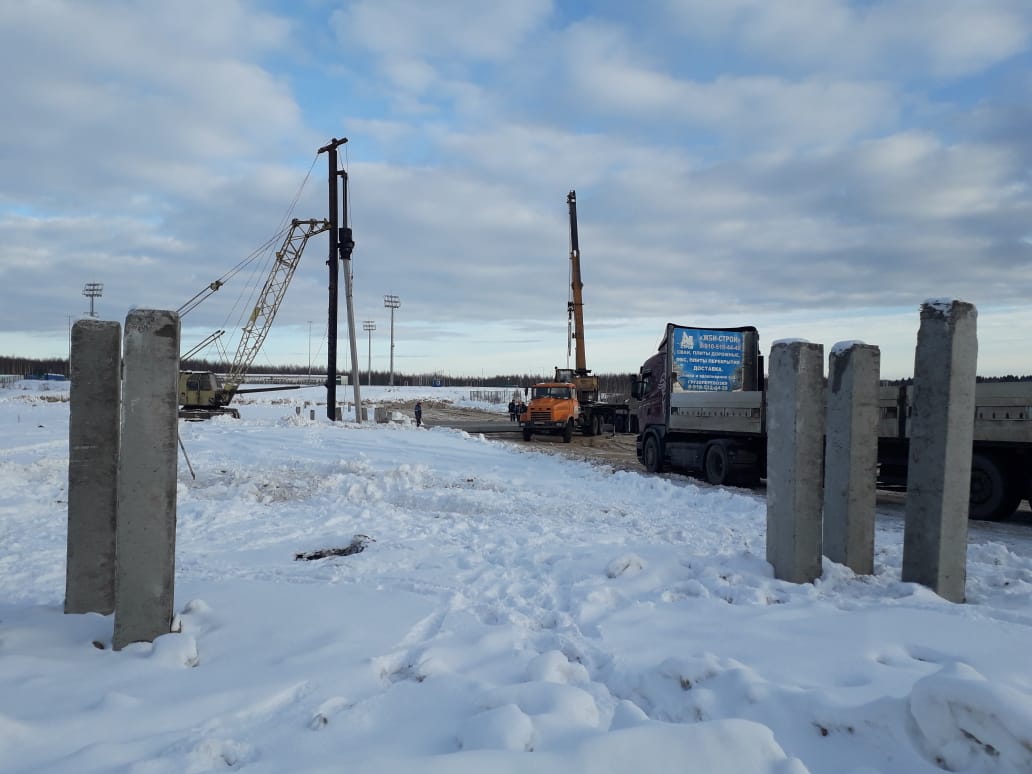 Сейчас строители занимаются устройством песчаного основания под здания манежа и забивкой свай.