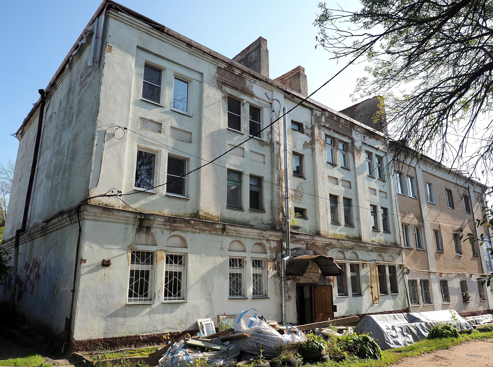 Балки перекрытия, подготовленные на замену, более месяца лежали на улице под дождями рядом со строительным мусором, об уборке которого тоже никто не побеспокоился. Часть разобранной крыши прикрыли плёнкой, а на оставшейся обнажённой кровле не сделали и этого, предоставив верхние этажи дождям. Кстати, подрядчиком на этом доме является ООО «ХЕОПС» (г. Брянск). Но, по информации жильцов, на кровле с весны работали гастарбайтеры, плохо изъясняющиеся по-русски.