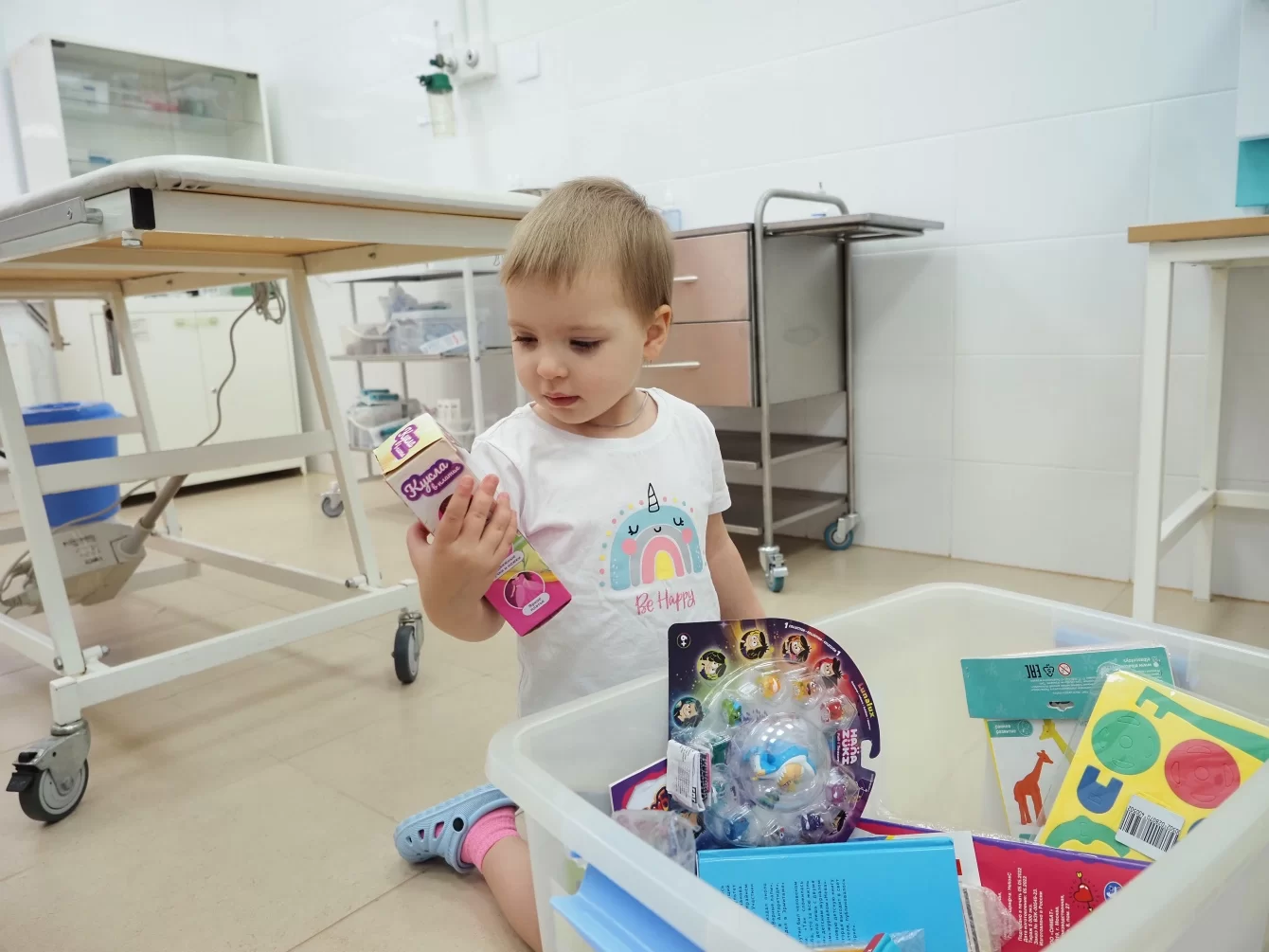 У малышки Полины слезы высохли сразу, как только перед ней поставили коробку с игрушками. Боль от процедуры забылась, и девочка с интересом стала рассматривать содержимое волшебной коробки. Выбрать было непросто: сначала внимание Поли привлекла какая-то хитрая игра, потом машинка, но тут она увидела куклу. Остановиться на чем-то одном маленькому ребенку, конечно, сложно, поэтому добрая медсестра Светлана к радости Полины разрешила ей взять и игру, и куклу. Крепко прижав к себе подарки, малышка отправилась в палату, показать свои богатства маме.