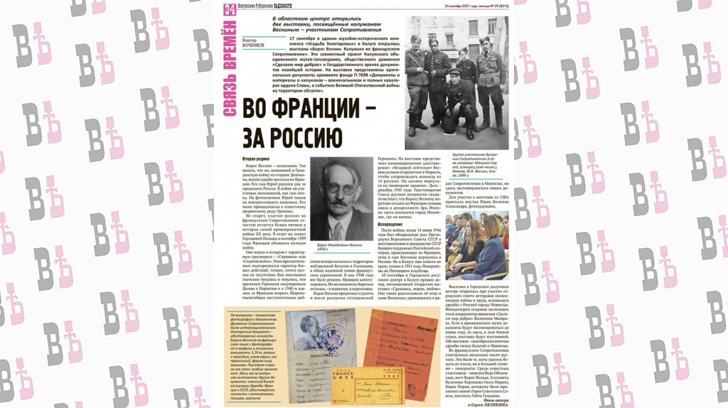 В середине сентября в усадьбе Золотаревых в Калуге открылась выставка «Борис Веснин. Калужане во французском Сопротивлении». Это совместный проект Калужского объединенного музея-заповедника, общественного движения «Сделаем мир добрее» и Государственного архива документов новейшей истории. Выставка посвящена калужанам Весниным – участникам французского Сопротивления. Виктор БОЧЕНКОВ побывал на выставке и рассказал читателям об уникальной экспозиции. Подробности читайте в материале «Во Франции – за Россию»