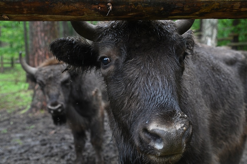 Когда ворота вольера были открыты, самые активные коровки (у зубров, кстати, матриархат) устремились в зелёные заросли, а быки предпочли задержаться.