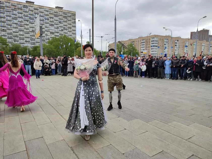 Профессиональные танцоры и участники спецоперации, получившие тяжелые ранения, станцевали Победный вальс.