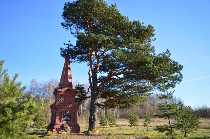 Вскоре после сражения вблизи дороги, ведущей в сторону Вереи, был установлен большой деревянный крест. В 1854 году на средства городского главы, медынского купца Николая Рябцева здесь был воздвигнут обелиск из красного кирпича. Под двумя разномерными каменными параллелепипедами находилось массивное основание; верхнюю часть монумента составляла двухметровая шестигранная пирамида, увенчанная крестом.Отсутствие каких-либо украшений, кроме кирпичных карнизов, придавало обелиску несколько аскетичный, но при этом торжественный вид. На одной из сторон сооружения была повешена икона святых Карпа и Папилы, днём памяти которых считается 26 октября. Ежегодно на годовщину сражения медынцы совершали к обелиску одобренный самим императором Александром II крестный ход с проведением молебна и панихиды по убитым.