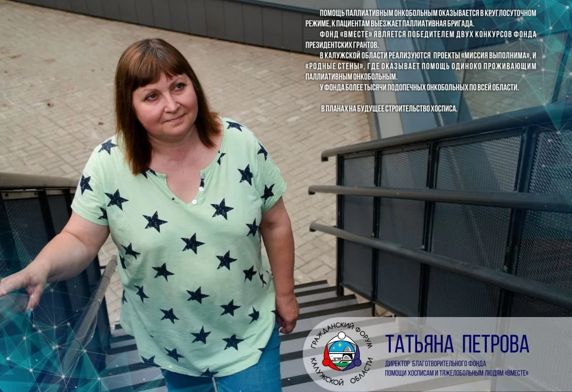 Этот фонд был создан ей в 2011 году для помощи хосписам и тяжелобольным людям. Сейчас Татьяна Петрова является директором и с помощью неравнодушных людей помогает самым незащищенным людям - паллиативным онкобольным.