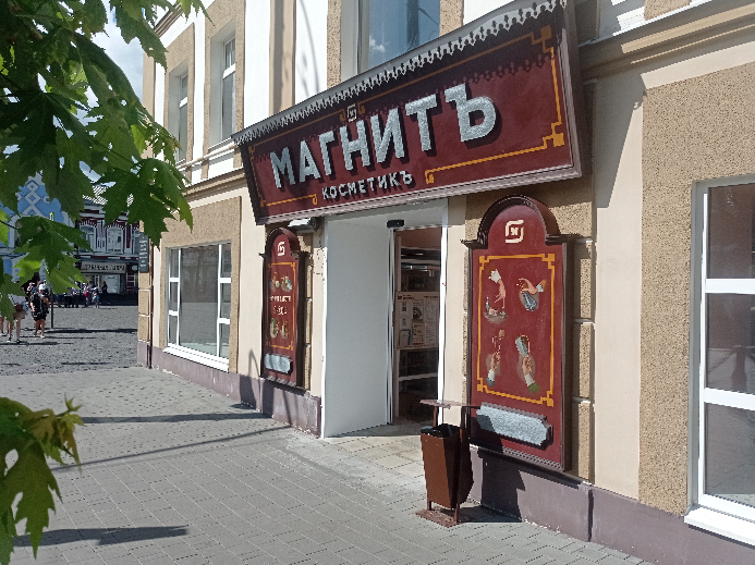 Особенно уродливо выглядят дома, где на первых этажах размещены сплошным потоком магазины, кафе, учреждения (улицы Кирова, Ленина, Московская, Жукова, Гагарина) разных фирм, брендов, владельцев. У каждого из них свой размер вывески, своя цветовая палитра, шрифт. В итоге абсолютно отсутствует комфортное визуальное пространство не только здания, но и улицы в целом.