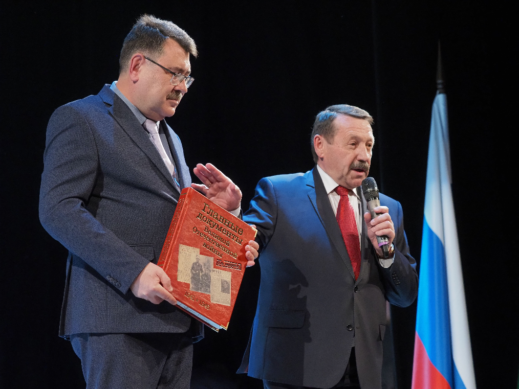 Самым теплым и душевным стало поздравление депутата Государственной Думы Геннадия Скляра. Выйдя на сцену, он подарил региональному отделению Союза журналистов летопись жизни страны в период с 1941 по 1945 год.