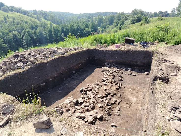 В XIV-XV веках Любутск был мощной, практически неприступной крепостью. Он располагался на высоком крутом мысу, образованном долиной Оки и оврагом, по которому протекает ручей Любутка. С третьей - напольной – стороны он был укреплен огромным земляным валом и глубоким рвом. В нынешнем году археологи заложили раскоп у самого склона, обращенного к Любутке, чтобы попытаться изучить структуру городских укреплений. Это удалось: на метровой глубине была обнаружена полоса каменной вымостки, являвшейся основанием деревянных укреплений. По мнению Игоря Болдина, с этой стороны крепости было достаточно обычного частокола – слишком уж высок и крут здесь склон мыса. Несущие бревна-колья опирались на особенно крупные камни, расположенные на одинаковом расстоянии друг от друга. Культурный слой сохранил следы сильного пожара в этом месте.