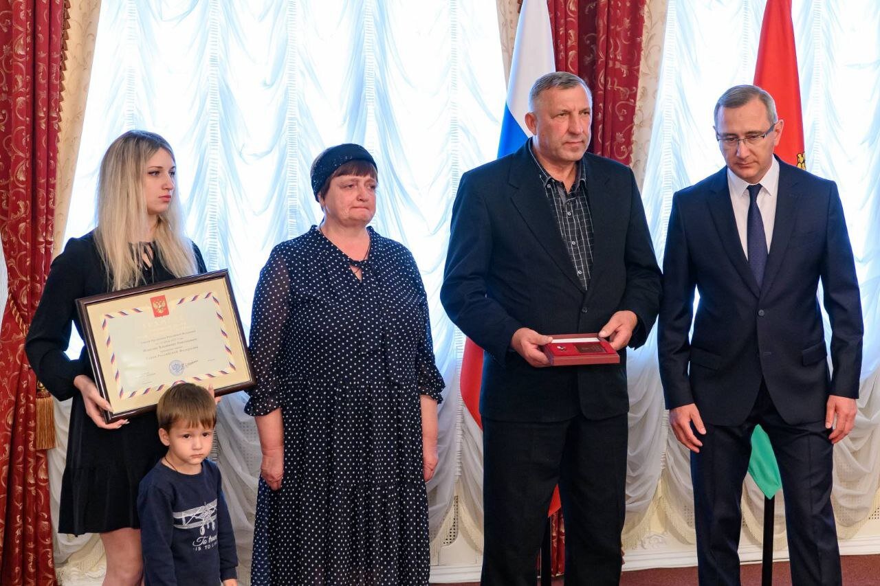 Грамоту о присвоении звания, а также медаль «Золотая Звезда» по поручению президента РФ родственникам погибшего передал губернатор Владислав Шапша.