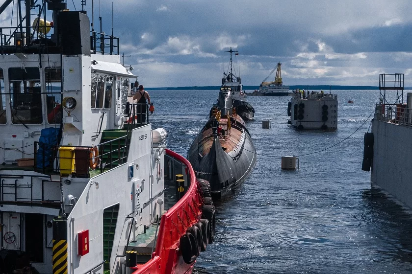 Работа по заводу лодки на баржу поистине ювелирная. Учитывая положительную плавучесть К-3, АПЛ потребовалось установить на расчетное место с максимальной погрешностью не более 150 мм. Сначала «Атлант» погрузился под воду, затем АПЛ была заведена и позиционирована точно над баржей. В настоящее время идёт процесс всплытия «Атланта». По прогнозу, это займёт порядка 8 часов.