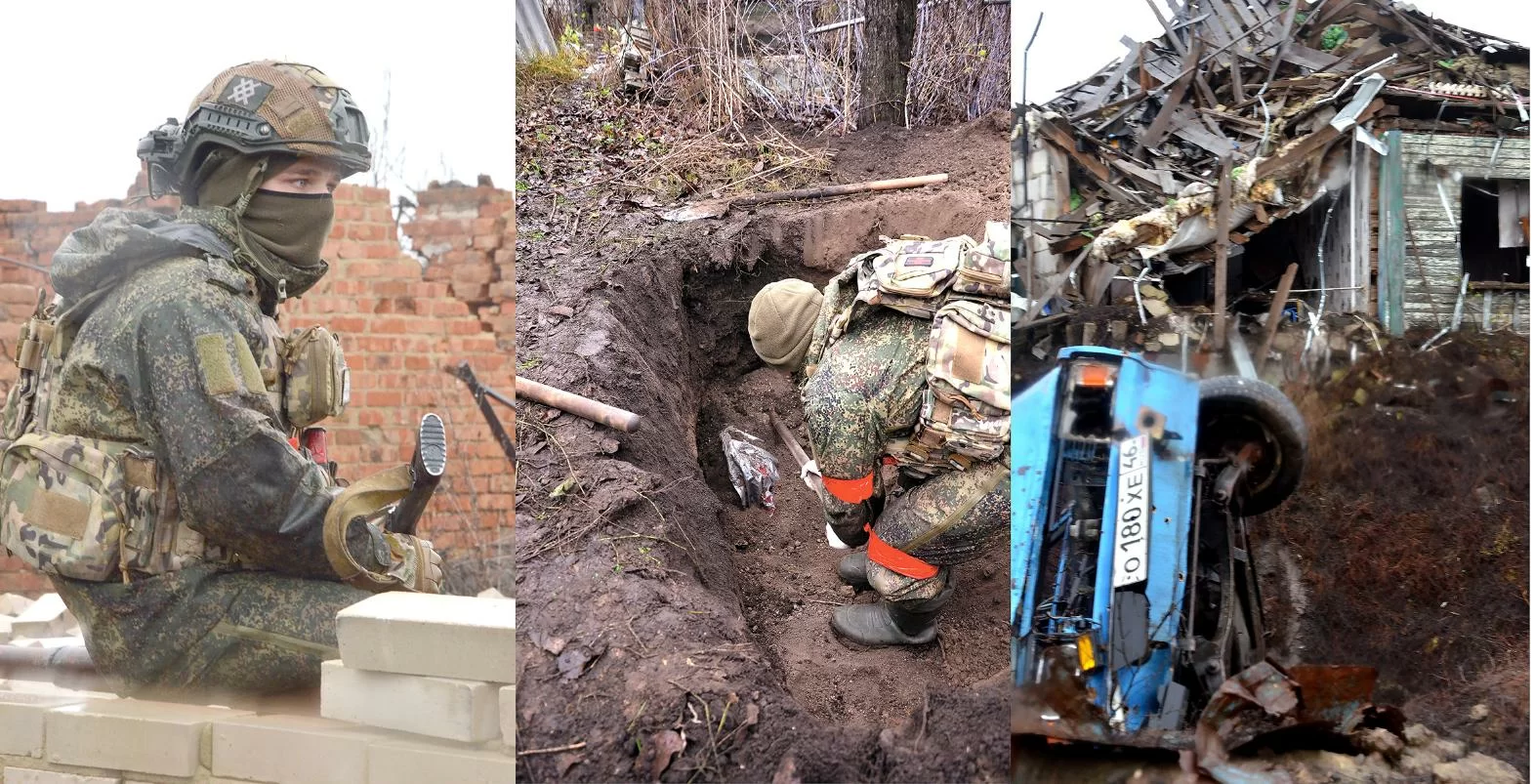 Погибший курянин не был найден ни у одной из трех обнаруженных воронок. Работы по поиску других жертв боевиков перешли в близлежащий поселок. Это один из многих населенных пунктов Курской области, превратившихся в «призраки»: люди ушли из этих мест. И даже собаки с кошками пропали с улиц, на которых шли бои.Во дворе одного из разрушенных домов была найдена наспех сделанная могилка. Обнаружили ее случайно, уже уходя, по воткнутому в землю настенному кресту. Пока двое бойцов работали лопатами, я услышал разговор Геннадия с «Орлом», командиром отряда. Они обсуждали список пропавших из пятисот имен, что был на руках у последнего.