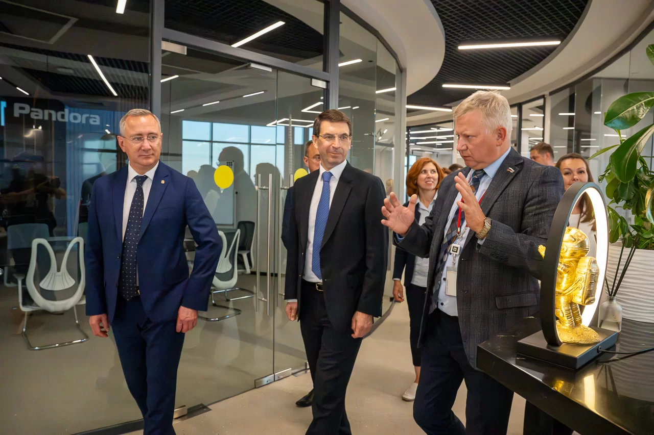 В ходе осмотра компании Игорю Щёголеву и Владиславу Шапше была представлена образовательная программа «Pandora ONE». Это интегрированный корпоративный проект подготовки молодых кадров и развития персонала, который включает программы наставничества и обучения нового поколения современных инженеров от успешных команд разработчиков одного из технологических лидеров современной России.