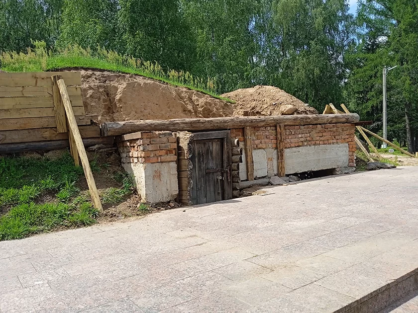 – Ремонта в землянке не было около 20 лет. Бревенчатые накаты со временем прогнили, и землянка стала протекать, это создавало неудобства для посетителей. Из-за протечек было принято решение заменить накаты, сделать гидроизоляцию, чтобы вода не попадала внутрь. Сейчас частично снят холм, меняются бревна, делается гидроизоляция. Землянка приобретет нормальный вид, без прогнивших деревянных конструкций и трещин на бревнах, – пояснил Сергей Беляй.