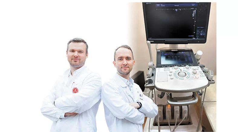 На приеме меня встретили сразу два врача-кардиолога – начальник отдела контроля качества и безопасности медицинской деятельности Андрей Багликов и заместитель главного врача по стратегическому развитию Николай Новицкий. Оба специалиста – кандидаты медицинских наук и преподают в КГУ имени К. Э. Циолковского. Скрининг начался с первичного осмотра по всем «канонам» и непринужденной беседы, во время которой доктора расспросили о всех хронических патологиях, вредных привычках, заболеваниях родителей, увлечениях, а также выслушали мои жалобы. Все это необходимо для составления верного и полного заключения. Данные записали в электронную систему, где уже отражены показатели сданных ранее анализов, что, кстати, весьма удобно.Врач прослушал легкие, померил давление в положении сидя и лежа, осмотрел артерии на стопах, под коленями, на бедрах, а также по бокам от щитовидного хряща (кадыка), по правой и левой стороне шеи. Это делается для того, чтобы выявить холестериновые бляшки, которые могут затруднять кровоток.