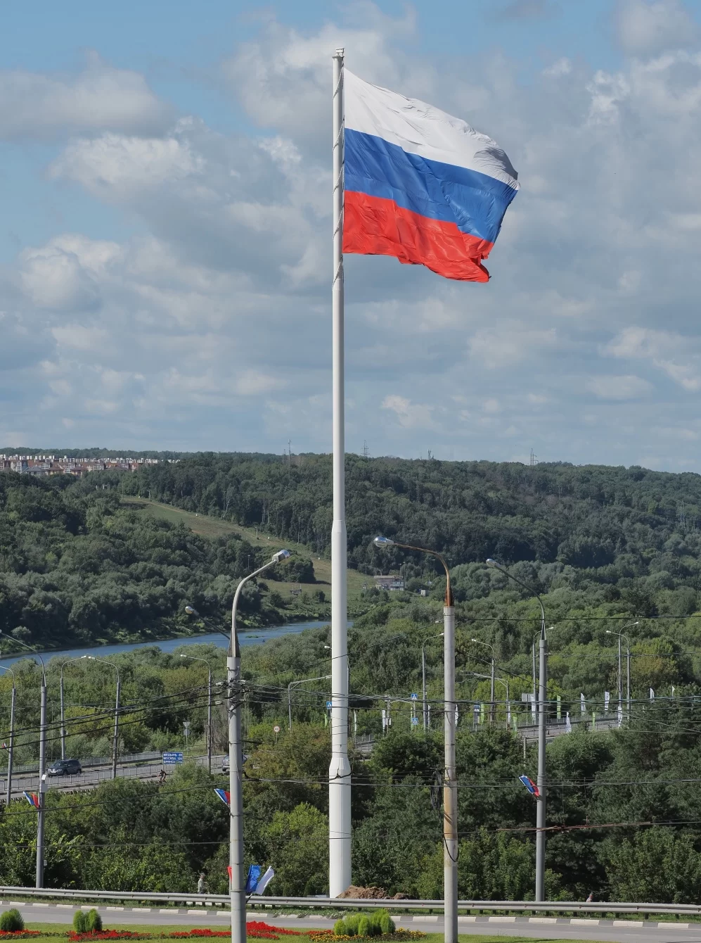 Огромный флаг украшает окрестности Калуги и на склоне холма возле 37-го километра автодороги федерального значения Р-132 «Золотое кольцо» у реки Оки. Гигантский триколор имеет размеры 30 на 20 метров.