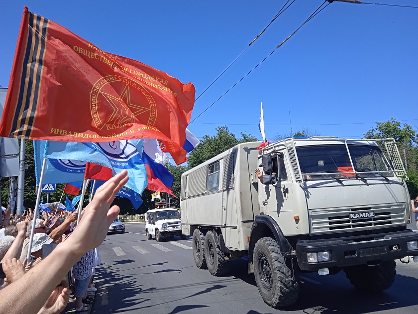 Автобус и автомобиль «Камаз» с участниками боевых действий проследовали от сквера Мира по улице Кирова. Акция состоялась у здания Арбитражного суда. В ней принял участие целый ряд общественных организаций: «Боевое братство», калужское региональное отделение общественной организации инвалидов войны в Афганистане и военной травмы – «Инвалиды войны», ДОСААФ, участники юношеских движений «Юнармии», «Волонтеры победы» и других. Выстроившись в ряд от сквера мира вдоль улицы Кирова. Калужане держали в руках российские трехцветные флаги.