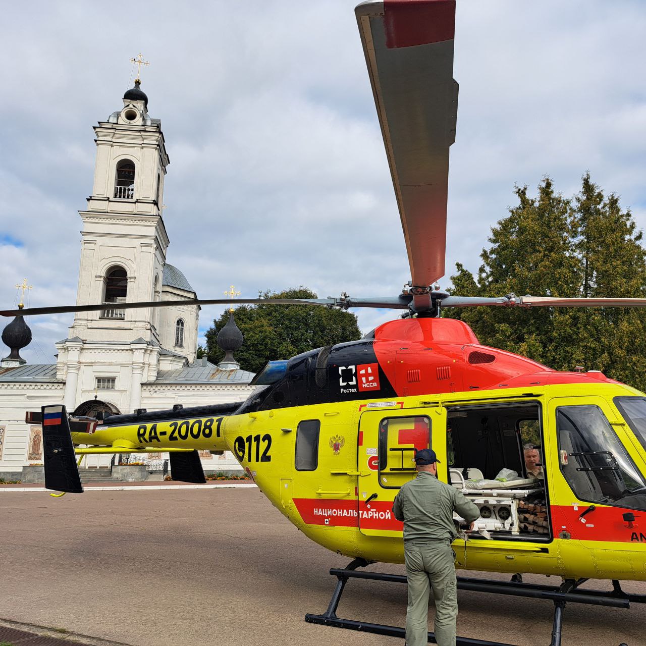 В районной больнице фельдшер и реаниматолог экипажа подготовили больную к транспортировке и сопровождению. Управляют вертолётом два командира воздушного судна, в прошлом военнослужащие.