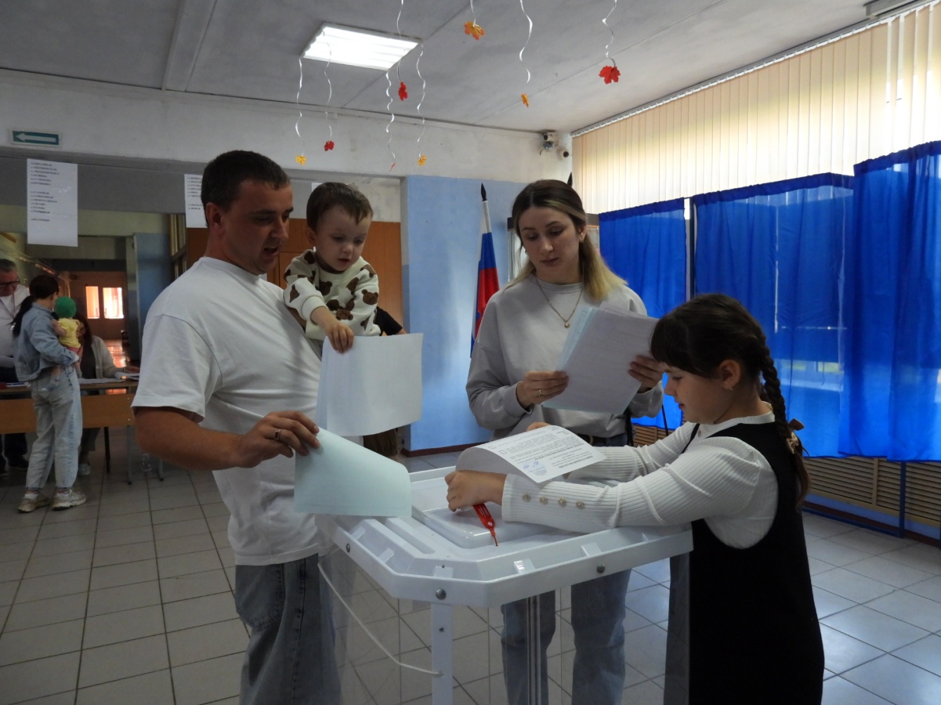 «»«Сегодня мы с супругой, с детьми пришли на выборы, потому что мы думаем не только о своем будущем, но и о будущем своих детей. Для нас важна сплоченность нашей семьи и граждан нашей страны», - говорит ветеран.В семье Алейник растут трое детей: семилетняя Катя, двухлетний Артем и шестимесячная Алиса. Как рассказала Лилия, именно старшая дочь вдохновила семью прийти на участок лично, а не голосовать дистанционно. Катя с большим удовольствием приняла участие в творческом конкурсе, организованном избиркомом, и нарисовала рисунок.