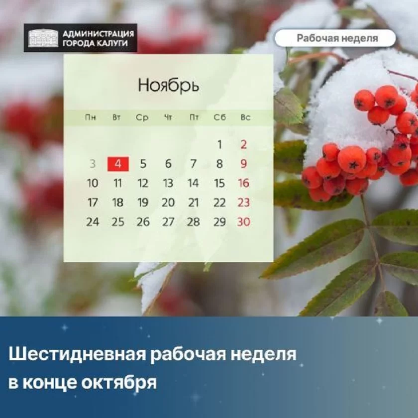 В Калужской области ожидается шестидневная рабочая неделя с 27 октября по 1 ноября.