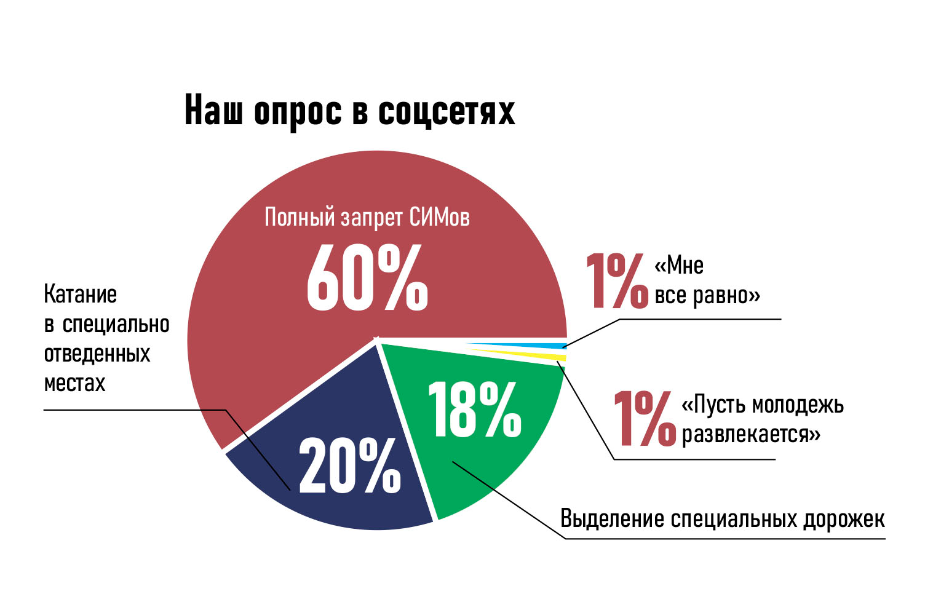 20 % требует, чтобы катание проводилось в специально отведенных местах. Примерно столько же (18 %) читателей выступает за выделение специальных дорожек для СИМов. Остальные выбрали ответы «Пусть молодежь развлекается» и «Мне все равно».