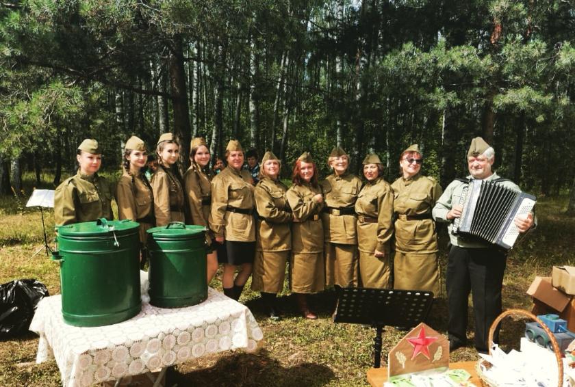 Праздничное мероприятие началось с выступления самодеятельных артистов. Девушки в форме времен Великой Отечественной войны встречали гостей под гармонь и песню «Катюша», дружелюбно одаривая их искренними улыбками и угощая традиционной полевой кашей.