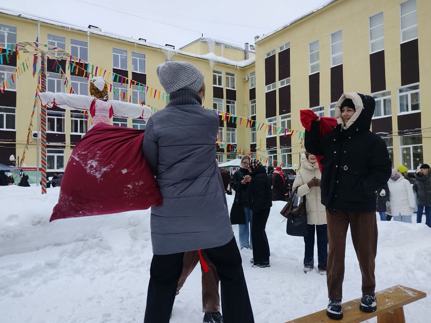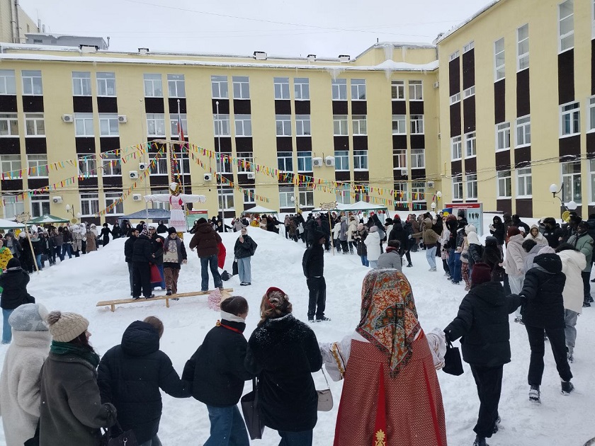 Музыка и ароматный запах блинов разливались по всей территории внутреннего двора университета и, словно магнитом, притягивали студентов на масленичные гуляния. Для всех желающих насладится праздничными угощениями стояли палатки, в которых можно было взять блины и добавить к ним совершенно разную начинку.